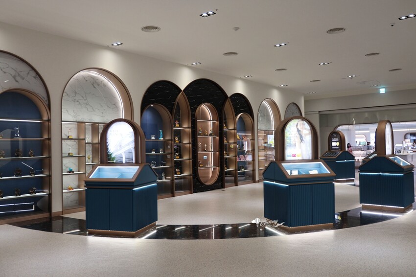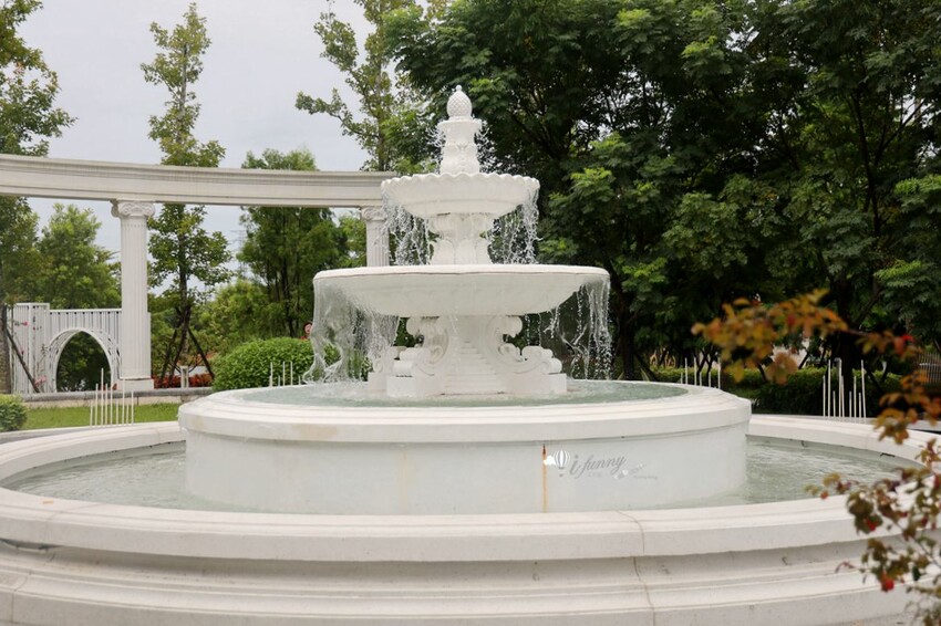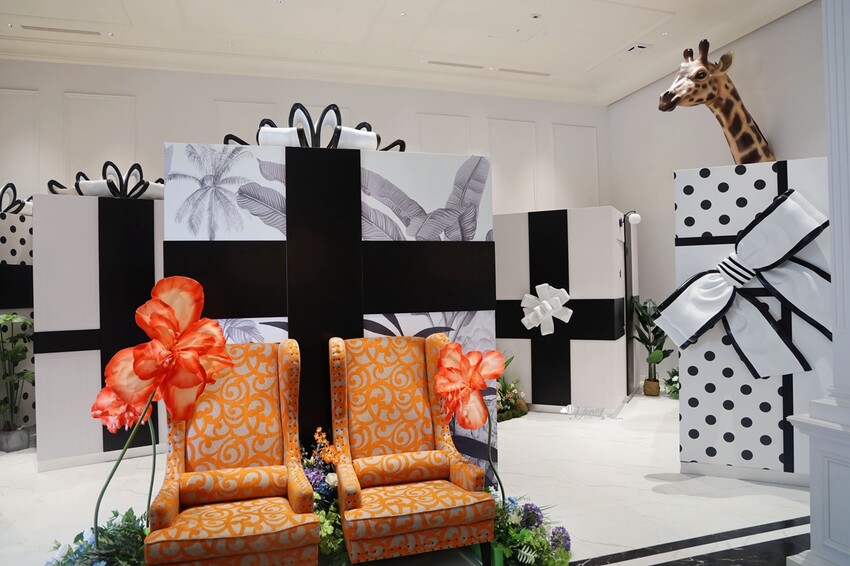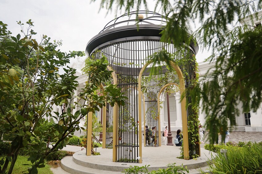 香氛記憶庭園包含了大型鳥籠裝置藝術及純白色古典噴水池為特色。