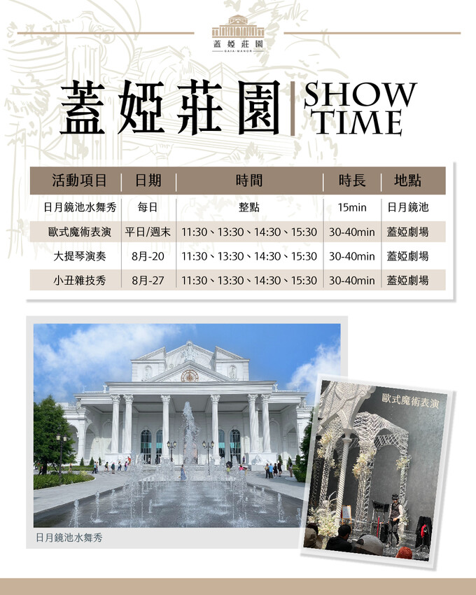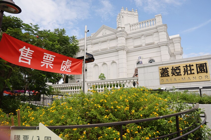 「蓋婭莊園」是由頂尖迪士尼建築設計團隊規劃及打造,園區占地上萬坪,建築中融合了希臘神話中大地女神「蓋婭」和守護神獸,皇宮般的建築充滿巴洛式風格,令人秒到歐洲,不用出國,也能拍到異國風情。