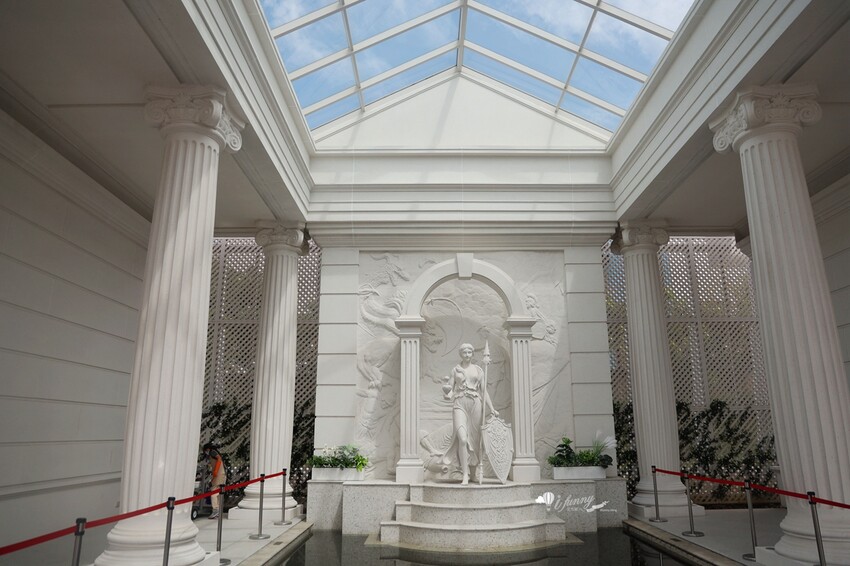 這個仿古的羅馬浴池,並非是印象中可以沐浴的浴池。蓋婭莊園設計了玻璃天窗引進了光線,讓智慧女神的雕像,更顯光亮聖潔。