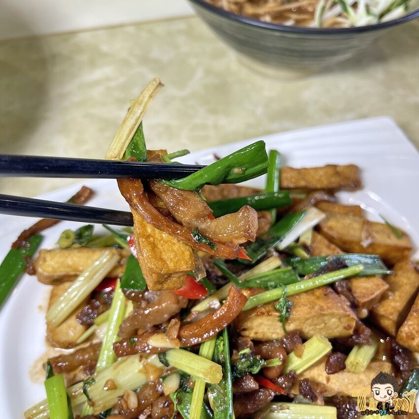 客家小炒鹹香不油膩,有魷魚、豆干、五花肉、芹菜等食材,是很下飯的菜色