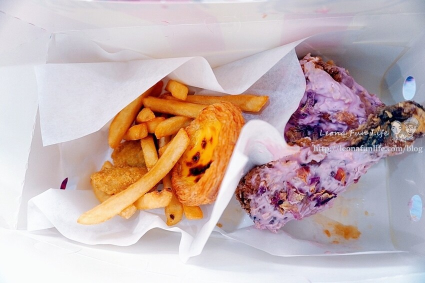 我們拿到的玫瑰粉紅巧克力脆雞是一腿一胸,