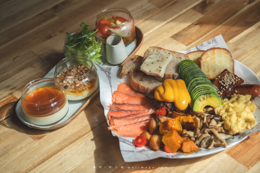 一整盤裡有招牌手打牛肉漢堡排、焦糖厚培根、匈牙利香腸、炒蛋、炒菇、炒薯塊、南瓜、節瓜、煙燻鮭魚再加上特製奶油跟自製的酸種麵包。