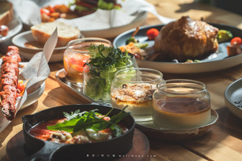 除了豐盛又營養的大拼盤外旁邊還有生菜、自製希臘優格、油封蔬菜及焦糖布蕾,實在太豐盛,這樣一盤營養超均衡。