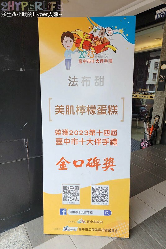 騎樓有法布甜榮獲2023台中十大伴手禮金口碑獎的立牌,優秀捏!