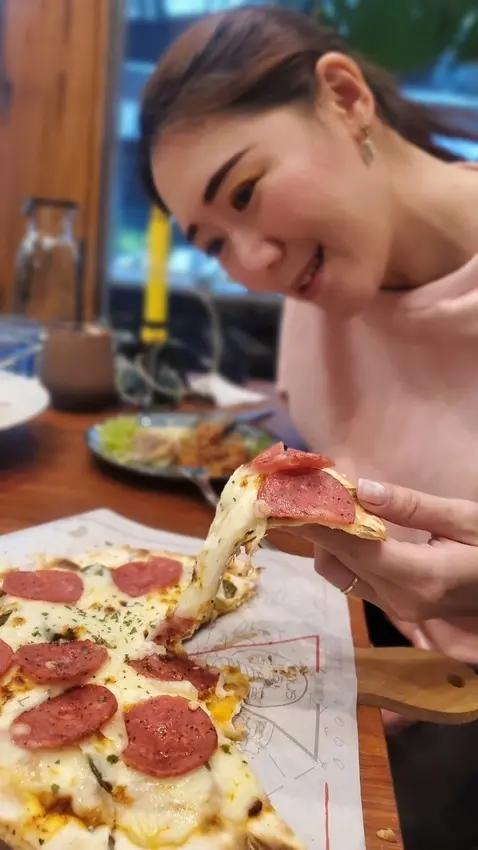 將韓式炸雞放上披薩,這樣的組合也是不常見的,我想今天吃到的料理大概率都是老闆親自研發的特色料理! 韓式炸雞肉質不乾柴,裹上的韓式醬料吃起來微微辣感和酸感。除了韓式炸雞外,披薩上還有添加韓式泡菜,韓感疊疊層加,簡直韓透了! 剛剛吃了英式的蘇格蘭蛋、義式的茄汁肉醬義大利麵,現在是韓式料理,各種異國料理超有創意不說,還都相當美味,意享美式廚房太絕了!