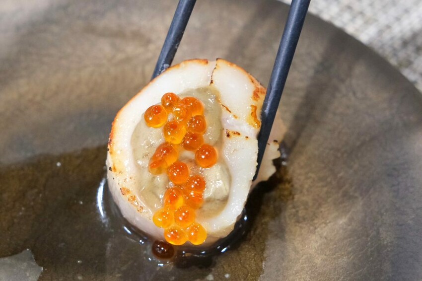 ▼嚴選北海道生食級干貝煎到5分熟,淋上三種昆布製成的醬汁搭配鮭魚卵,干貝的口感軟嫩好咬,鮭魚卵吃起來逼逼波波,多層次的海味在嘴裡舞出華麗旋律!