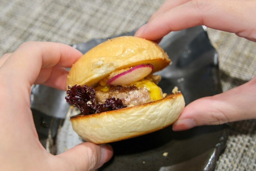 ▼香噴噴的誘人和牛小漢堡,將法國布里歐麵包以牛油煎過成就香酥口感,中間夾入日本A5和牛排、生菜和帕瑪森起司,一咬下整個肉汁瞬間炸出,口感超級豐富!