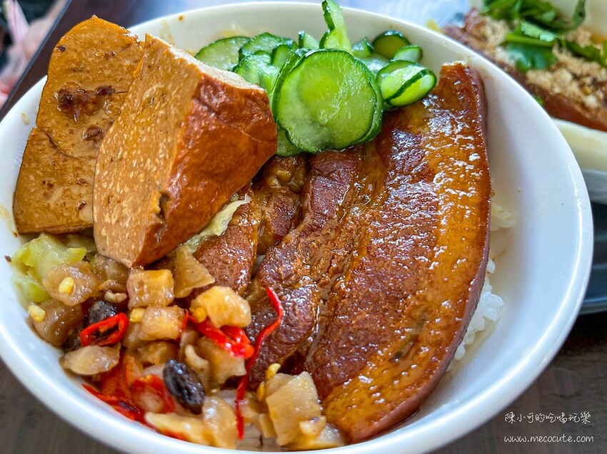 因為米其林必比登推薦更爆紅的焢肉飯讓許多人慕名而來,配菜是小黃瓜和滷豆乾,份量其實不多,像我女生要吃一碗焢肉飯和刈包才會飽。