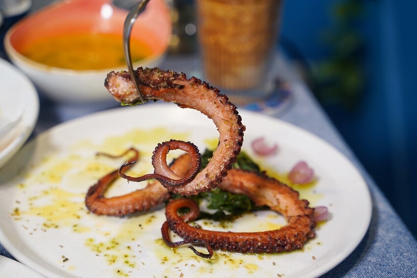 說到希臘菜,你一定要知道的「烤章魚腳佐巴薩米可醬」,就像台灣的鳳梨蝦球一樣是很經典傳統的在地美食,章魚腳先經舒肥過再下去烤,調味以微酸的巴薩米可醬為主,調味不會過重,還吃得到章魚本身的鮮甜滋味,旁邊還有煮至軟爛的莧菜可以搭配著享用。