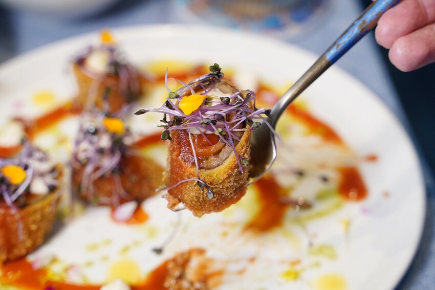 「希臘穆沙卡茄子肉醬卷」口感外酥內軟,還有肉醬的彈牙滋味,整體味道以番茄香氣為主,味道、口感都很豐富,整道菜精緻且有高級餐廳的水準,推薦必點!
