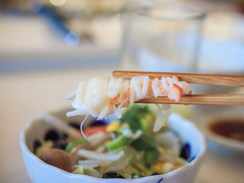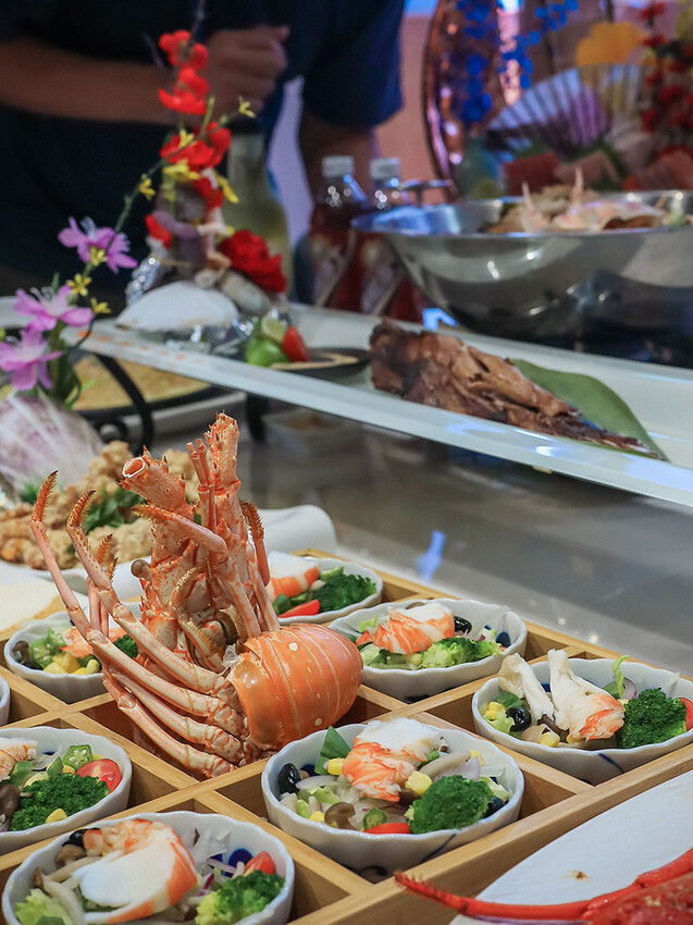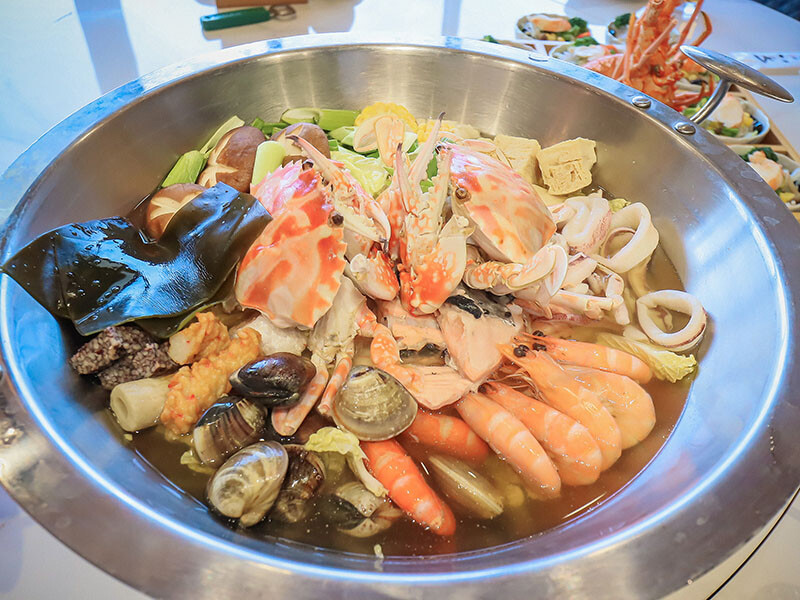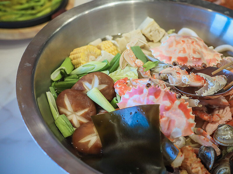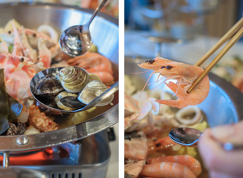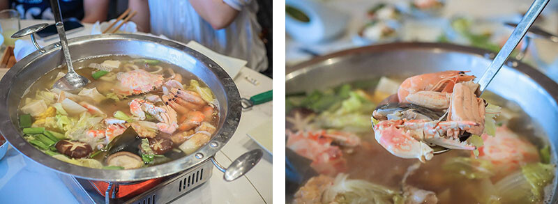 今天的鍋物幫我們搭配的是以花蟹為主的海鮮鍋,有多隻白蝦、透抽、蛤蜊加上蔬菜、竹輪、香菇與昆布湯頭熬煮,湯頭清澈鮮美,花蟹主要是吃其蟹肉,貼心地也幫大家都拆好,抓取一段即可輕鬆享用。