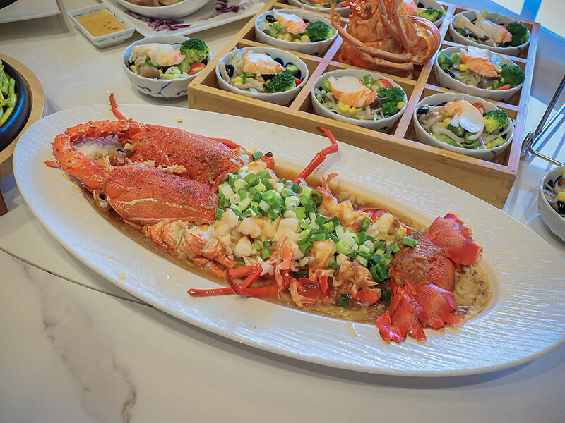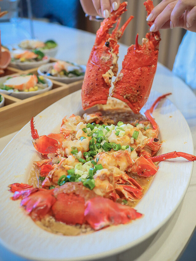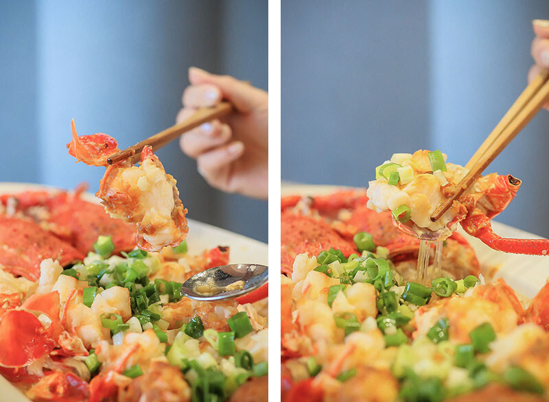 這是今天這桌的第二尾龍蝦了 XD 龍蝦處理好與蒜油一同清蒸,鮮美的龍蝦肉以蒜香點綴,一人取用一塊剛剛好,就連蝦腳都可以撥出肉來喔~底層店上粉絲豆腐煲,吸了滿滿的龍蝦鮮海味十足。