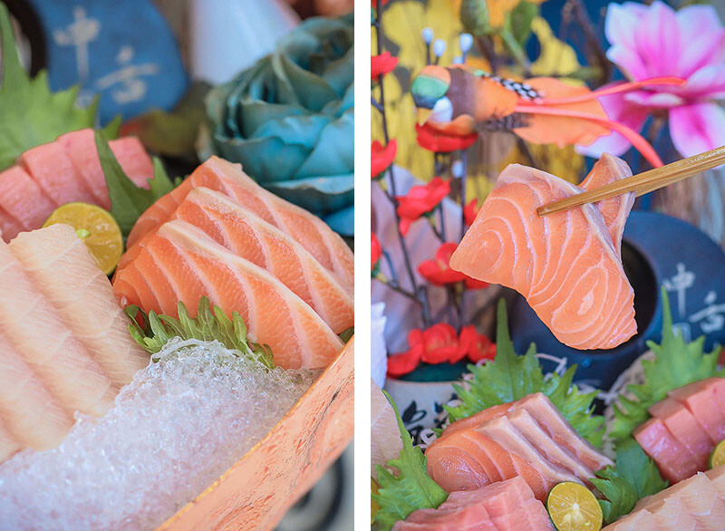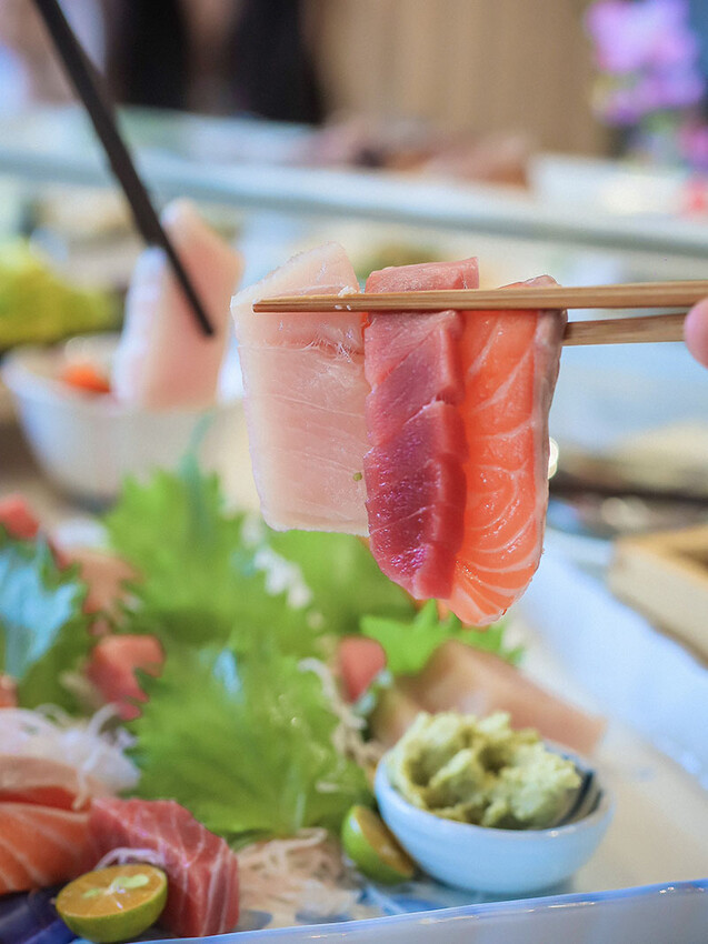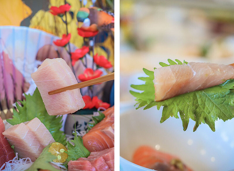 這次一共品嘗了東港黑鮪魚、鮭魚和白旗魚刺身,海中和牛的黑鮪魚多些油脂的透色,細緻的肉品看似綿密實而柔軟得入口即化~