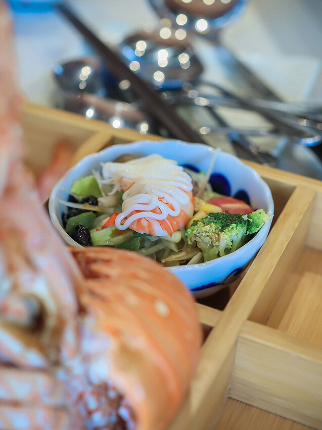 一上桌當然就是先來個開胃沙拉,用的是時下流行的文青九宮格~下層的生菜沙拉微酸的滋味清新爽口,還有小朋友喜歡的黑豆,上頭鋪著是這麼豐厚的一塊龍蝦肉,可不是來打醬油的龍蝦肉片喔~