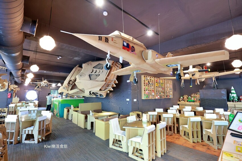 紙箱王創意園區的餐廳裡以紙為主題,坐在椅子上也是紙張做的,就連上方的大飛機跟跑車也是紙做的喔!假日其實很建議提早預約用餐座位,紙箱王創意園區餐廳的餐點很值得一試。紙箱王門票200元可以折抵100元紙箱王商品與餐點,拿來換紙箱王最夯的紙火鍋或紙箱飲料都好誘人。