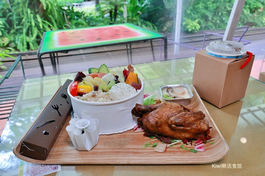 餐點中包含花椰米溫沙拉、爐烤香料春雞、醬料、蒸蛋、紙盒餐具組、紙箱飲料。