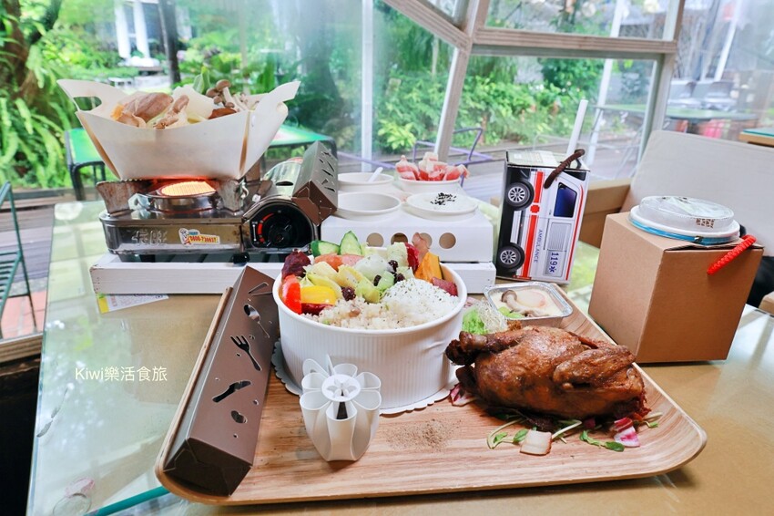 紙箱王創意園區餐廳也是很多親子、朋友推薦的喔!來紙箱王要吃餐點,所以我們套票上包含輕食餐點,花椰米溫沙拉爐烤香料春雞,醬料選擇香柚醬、牧場牛奶火鍋,兩杯飲料。