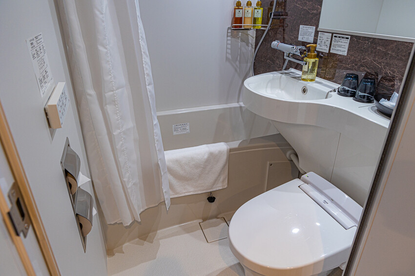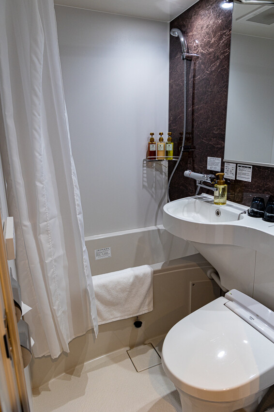踏進房間首先會是衛浴空間,日本的商務旅館衛浴空間的設計都差不多,有著免治馬桶和盥洗備品,整個衛浴打掃得還蠻乾淨,其實空間大小對我來說不是很重要,我的重點都是衛浴乾淨最重要。