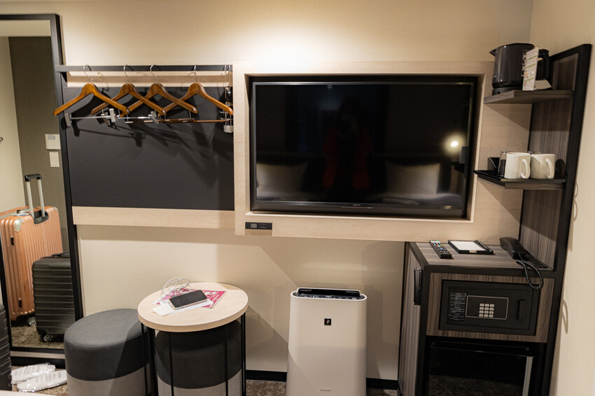另一側的牆壁有著吊衣架、電視、穿衣鏡、空氣清淨機和小圓桌椅,小巧的空間裡放置了商務飯店應有的配備。