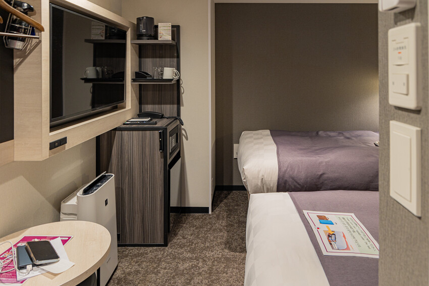 來到住宿的房間,這次入住的房型是雙人雙床的房間,房間的空間略微小些,但是大行李箱還是可以打開放置的。