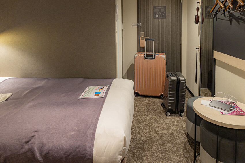 以淺灰色系為主體,房間內是以地毯鋪置減少行李等的摩擦聲音,走道的寬度30寸的行李打開還有些空隙可以走動。