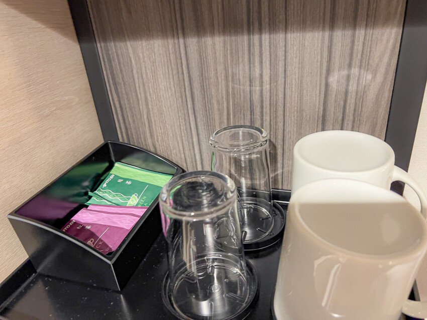 另一側的層架有著熱水壺、茶包和茶杯可以供旅客使用。