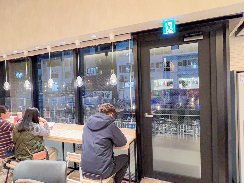 一樓的後方是餐廳正對著道頓堀,晚上時刻有許多旅客會買些東西坐在這裡用餐。