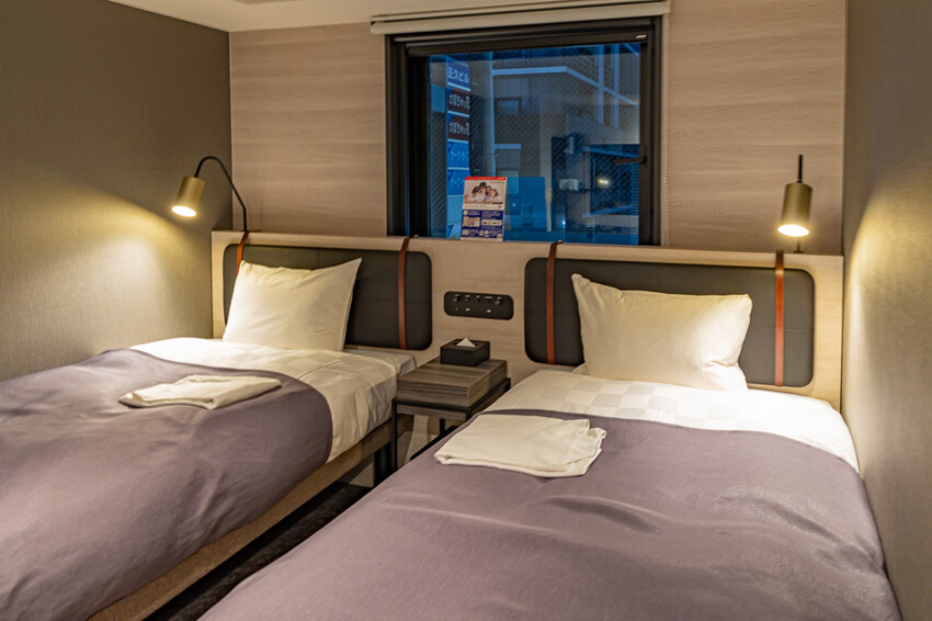 兩張單人床鋪上方有著小閱讀燈,還有著窗戶房間增加明亮度,床鋪的柔軟度還不錯,我個人認為枕頭偏軟些。