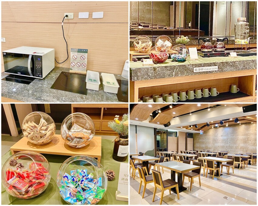 目前旅店是沒有提供早餐的服務,所以原本的餐廳拿來當作交誼廳,還提供四款小點心及熱茶、水果水,還提供微波爐免費提供給入住房客使用,熱牛奶或是微波加熱食物都很方便。