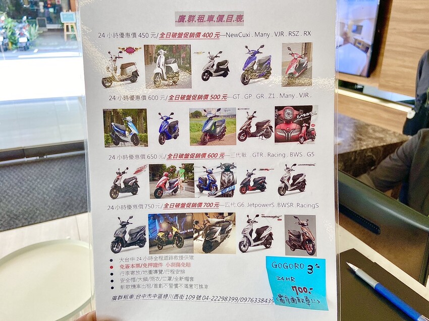 飯店也有配合的租賃機車店家及代叫計程車的服務,下次想要租機車暢遊台中景點。