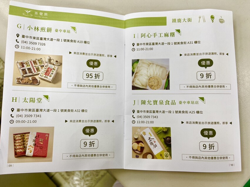旅店推出「旅遊護照」使用期限到今年12月底,有不少附近的合作店家提供折扣,如果有興趣可以向櫃檯領取,連台中車站內的伴手禮店家也有合作折扣。