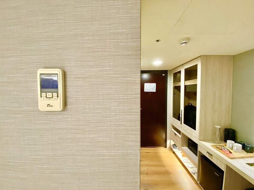 冷氣溫控也很穩定,涼爽的很舒適,不會有雜音。衣櫃採感應式亮燈,房間內提供小型保險箱,一次性拖鞋