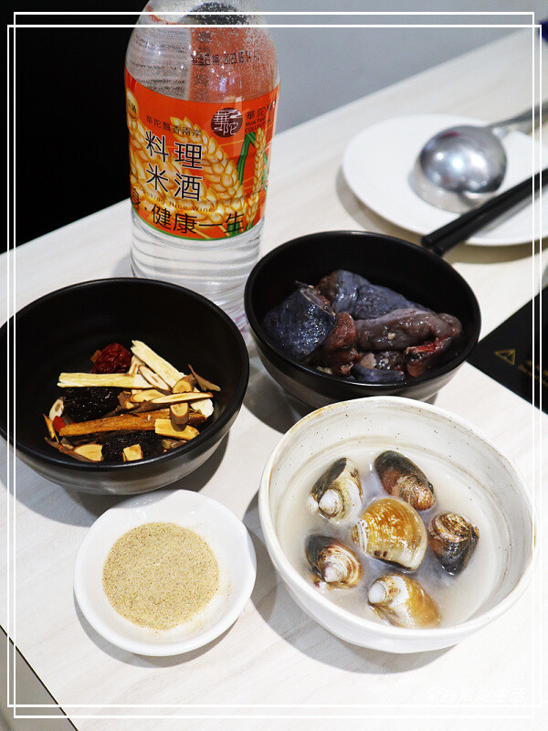 服務人員先送上食材備料,此鍋重點食材為烏骨雞及蛤蜊,等等會加入的中藥材及米酒——