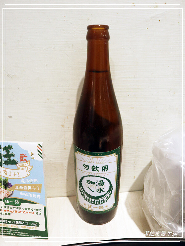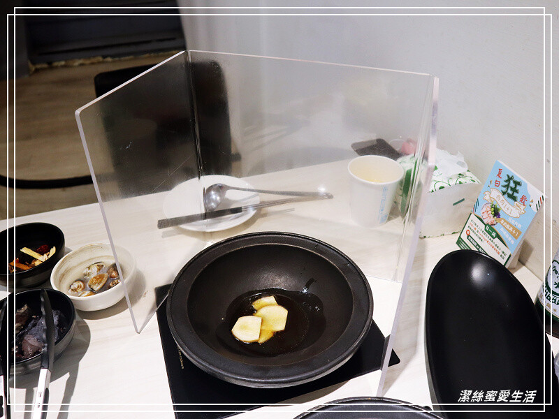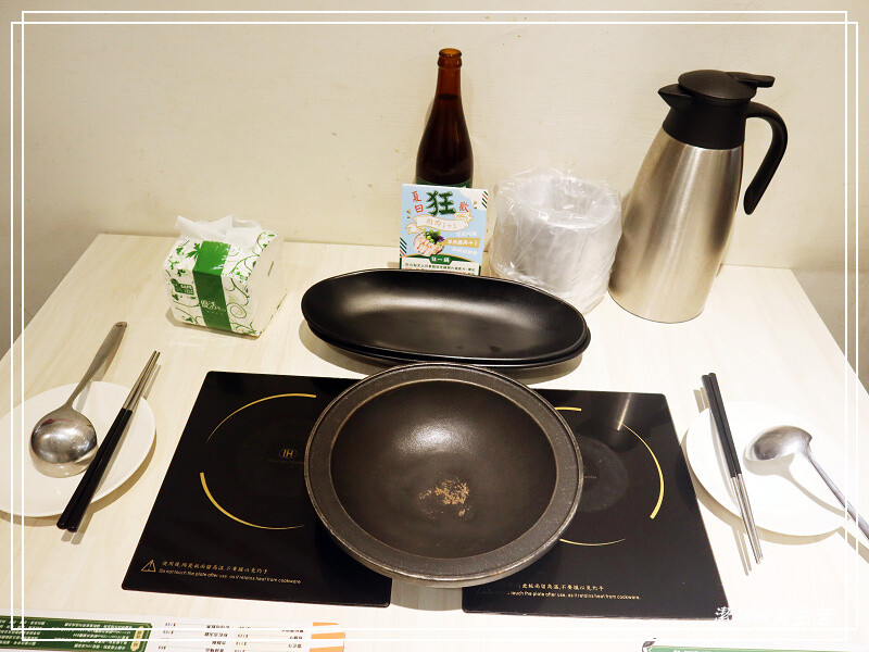 桌面都已擺好餐具,橢圓盤是夾取自助吧食材用,後方的酒瓶是生水哦,勿直接飲用~用米酒瓶裝著有點可愛😆,若是中途覺湯太鹹可加~另一壺則是高湯。