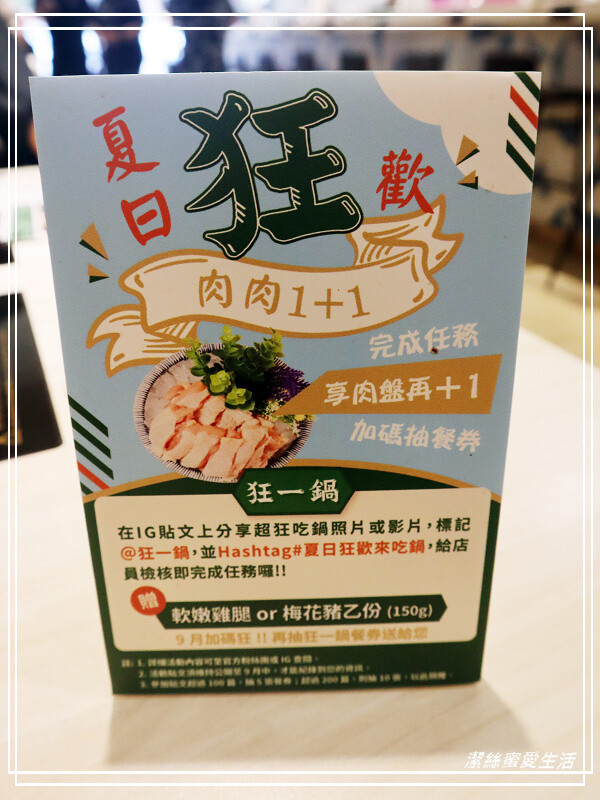如果肉肉控還不滿足,狂一鍋也推出限定活動,只要在IG貼文分享吃鍋照片或影片,並TAG狂一鍋及關鍵字,就可完成任務,贈送雞腿或梅花豬一盤!