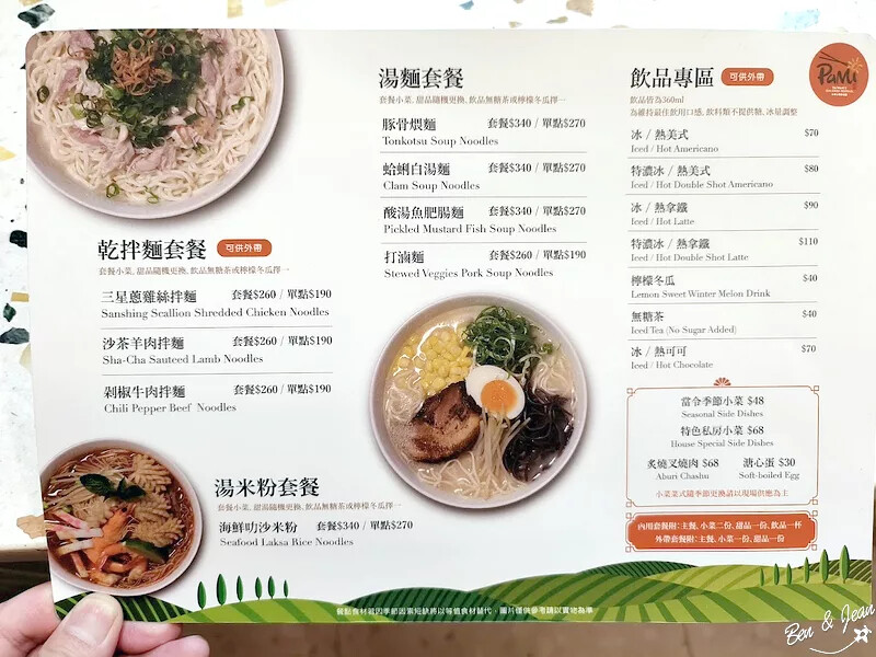 主打出宜蘭的代表口味『三星蔥雞絲拌麵』, 代表台灣口味的『沙茶羊肉拌麵』、『蛤蜊白湯麵』;充滿異國風味的『海鮮叻沙米粉』、『豚骨煨麵』;重口味絕對會喜歡的『剁椒牛肉拌麵』、『酸湯魚肥腸麵』和『打滷麵』
