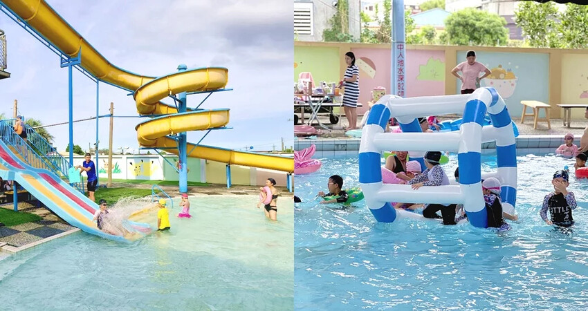 松樹門游泳池》三層樓高空滑水道好刺激,大型水上玩具超好玩 ,天然湧泉水質清澈好清涼