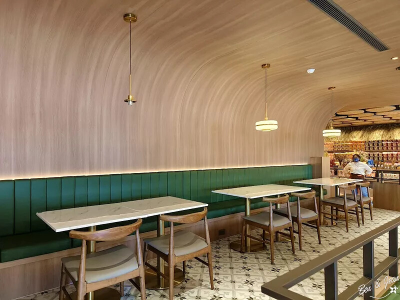 櫃台後方是用麵體做成的裝飾物,排列整齊很像磁磚呢