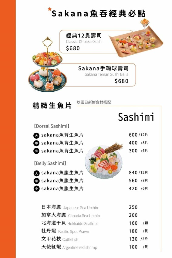 吃慣了一般日式料理,不妨來Sakana魚吞壽司品嘗不一樣的創意日式料理,將日式料理結合西式精緻擺盤,道道都讓你驚艷不已,餐點高貴不貴,還有客製化生魚片丼飯、炙燒丼飯及無菜單料理,空間寬敞舒適,也有提供包廂座位區,當月壽星提前預約還可享壽星優惠活動,另外於9/1~9/30用餐出示文章並按店家粉絲團的讚,結帳即享九折優惠