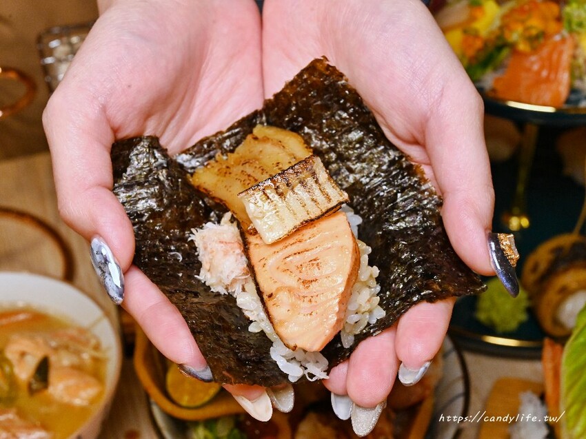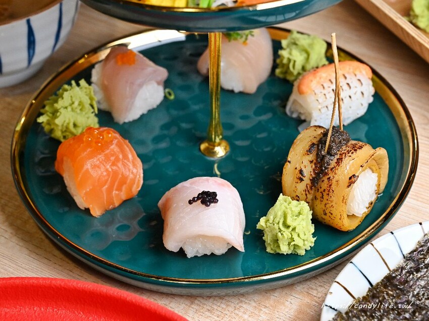 下層的手鞠球壽司比一般握壽司再mini些,可以直接一口塞,裡頭包含鮭魚握壽司、炙燒黑松露星鰻握壽司、海鱺魚握壽司、紅甘魚握壽司、明太子紋甲花枝握壽司等,各個都鮮味十足呢