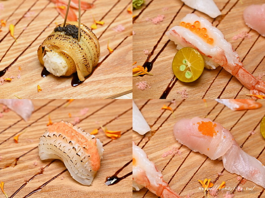 黑松露星鰻握壽司肉質細緻,經過炙燒香氣更加迷人,搭配黑松露層次更豐富;肥美鮮甜的天使紅蝦握壽司,裡頭搭配嗶嗶啵啵的鮭魚卵,鮮甜滋味大爆表;明太子紋甲花枝握壽司糖糖也很愛,軟嫩的紋甲花枝搭配明太子超讚