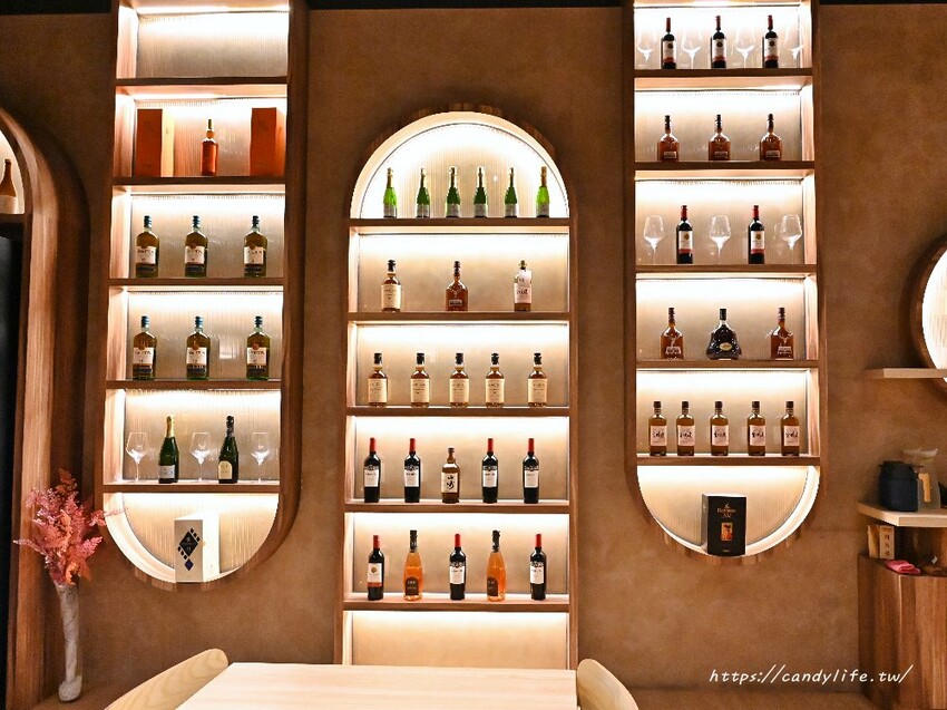 魚吞壽司除了日本料理店常見的清酒、啤酒外,還有一個酒櫃牆,裡頭擺放著紅酒、白酒、威士忌等比較偏法式餐廳會出現的酒品