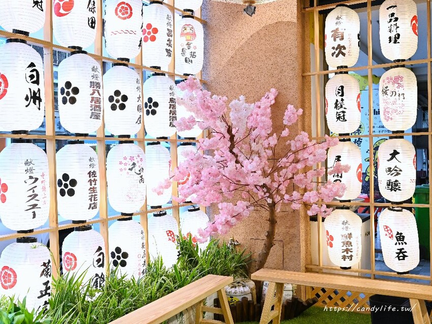 魚吞壽司外觀除了美美的燈籠牆外,還擺放了各式各樣的精緻紙傘及粉嫩的櫻花樹,在這裡取景拍照超級美