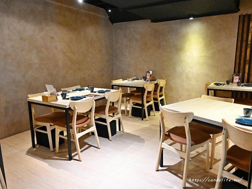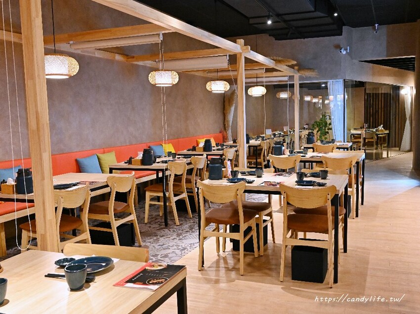 魚吞壽司店裡頭採挑高設計,空間非常寬敞,燈光明亮,座位數也非常多,前方區域採開放式座位區,主要以2-4人座為主