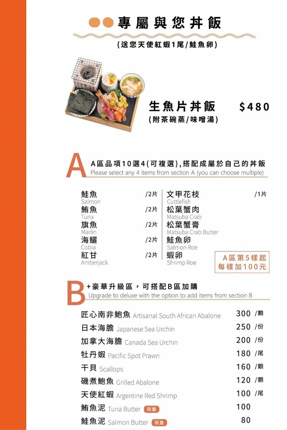 魚吞壽司的生魚片丼飯及炙燒丼飯很特別,可以從十種品項中選擇自己喜愛的四種食材,糖糖這次選了星鰻、鮭魚、松葉蟹及比目魚鰭邊肉,另外加價100元多了天使紅蝦,整碗丼飯超澎派,完全看不見底下的醋飯啦