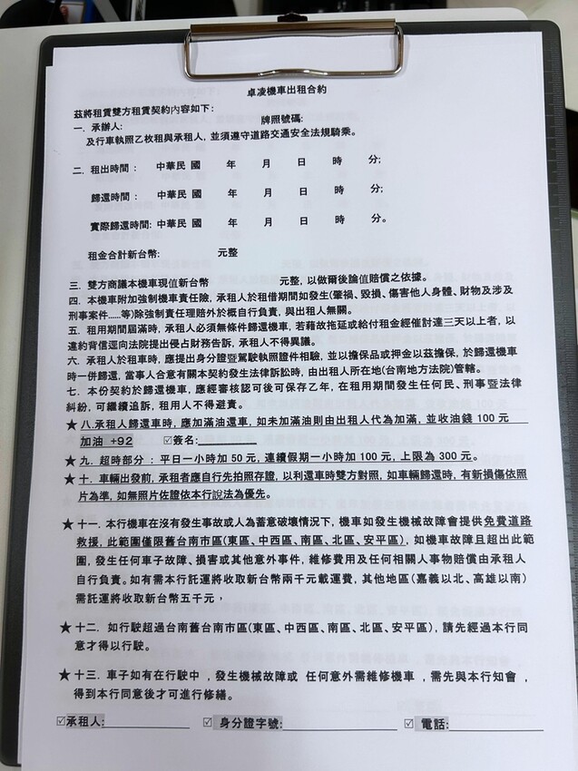 ▲這是「卓凌機車出租」的合約,裡面有寫著租車的注意事項,這邊是免簽本票的!記得當天租車要帶雙證件(包含機車駕照)給店家,租車時需要押一張證件在店內!