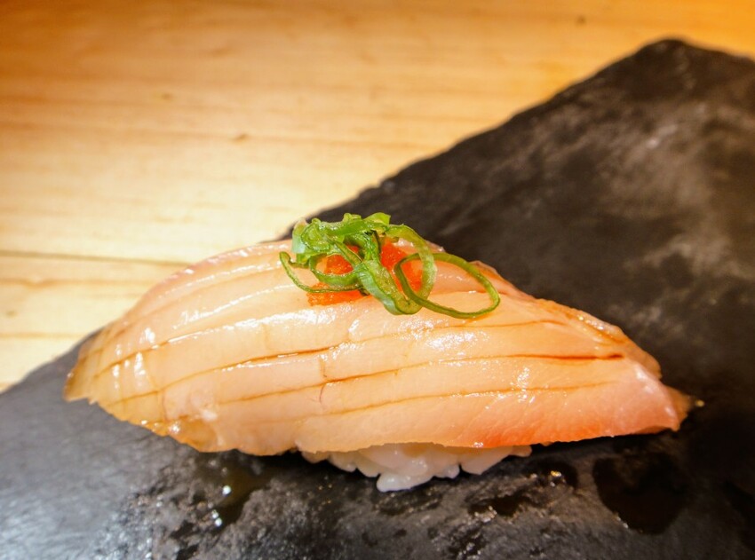 「獅魚握壽司」加上辣蘿蔔泥及蔥花,入口後溼潤飽滿,食材碰撞出燦爛的火花,留下難以忘懷的感受。