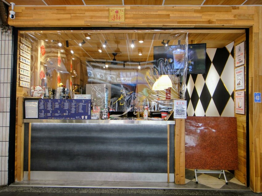 無飲新莊店外的以原木裝潢及暖色調的燈光,並裝飾著許多的春聯,給人喜氣及溫暖的氛圍。