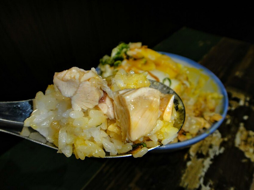 想要增添不同風味,建議可再加入店家自製辣蘿蔔,嗆辣口感直衝腦門,一大碗的雞肉飯團子沒兩下全部嗑得精光。