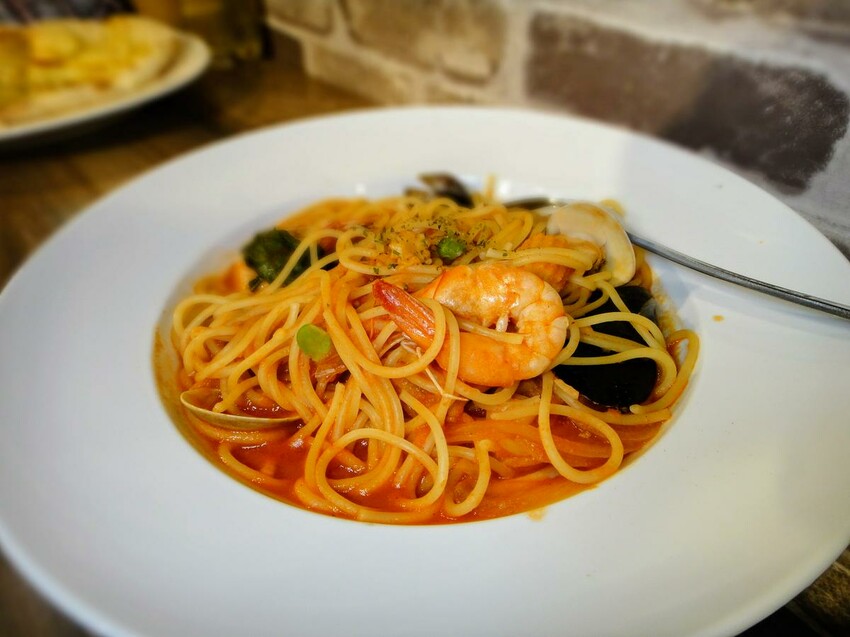 喜歡吃海鮮的朋友一定不要錯過「番茄海鮮麵」裡面有滿滿的海鮮,包含已經去殼的白蝦、蛤蠣、中卷、貽貝等,澎湃又豐盛,麵條使用義大利進口杜蘭小麥粉製成,麵條Q彈滑口,還有玉米筍、豆子等時蔬,搭配番茄紅醬酸甜適中好開胃。